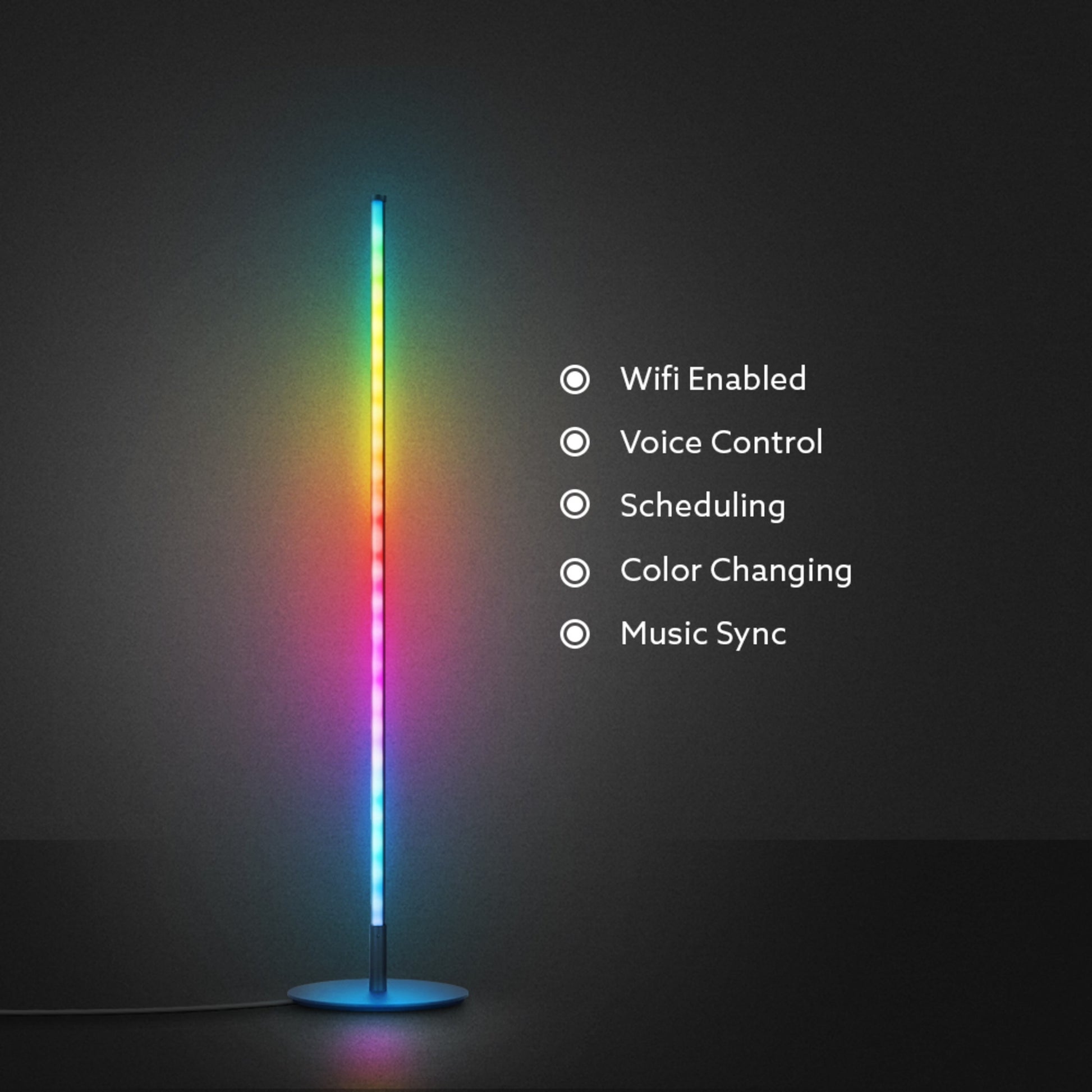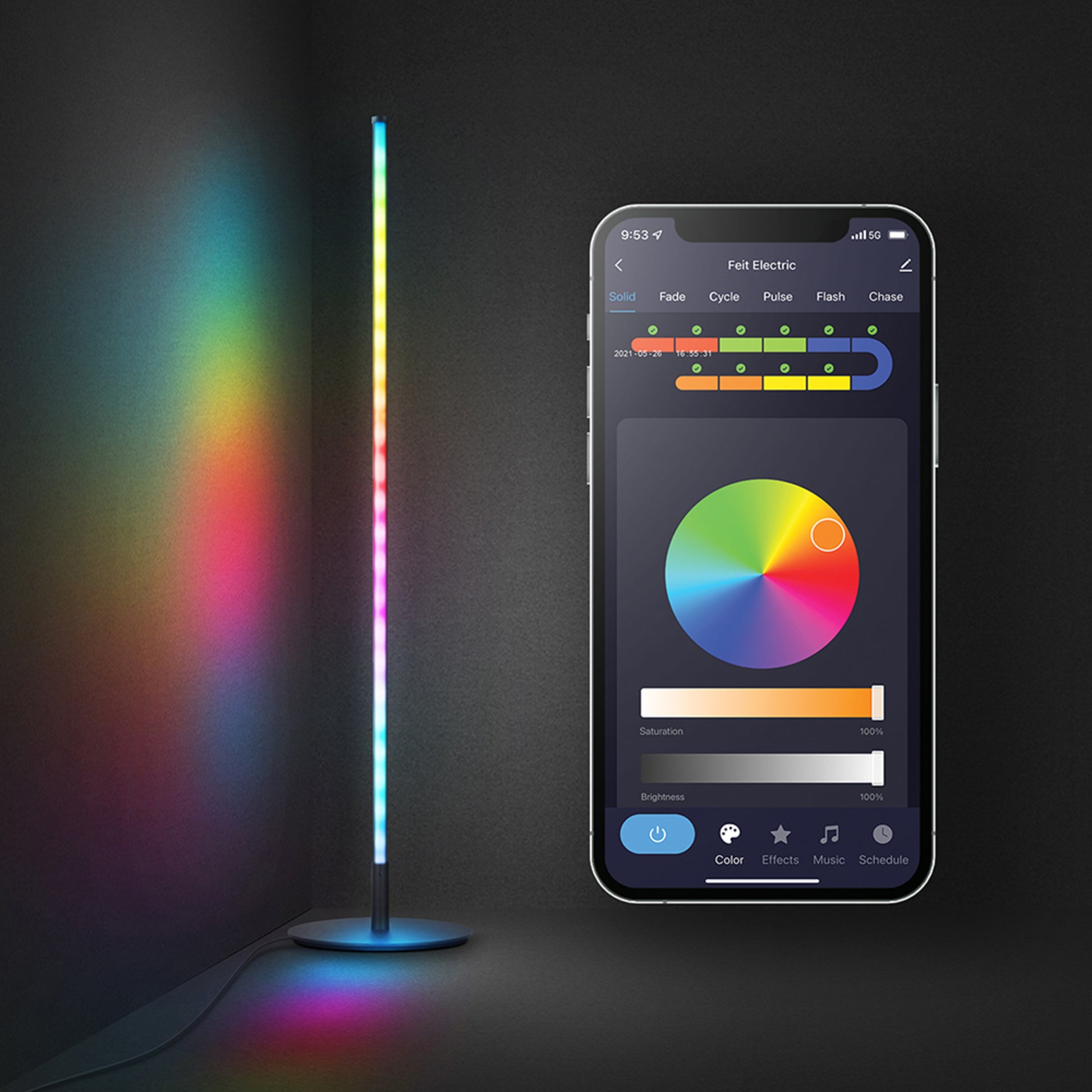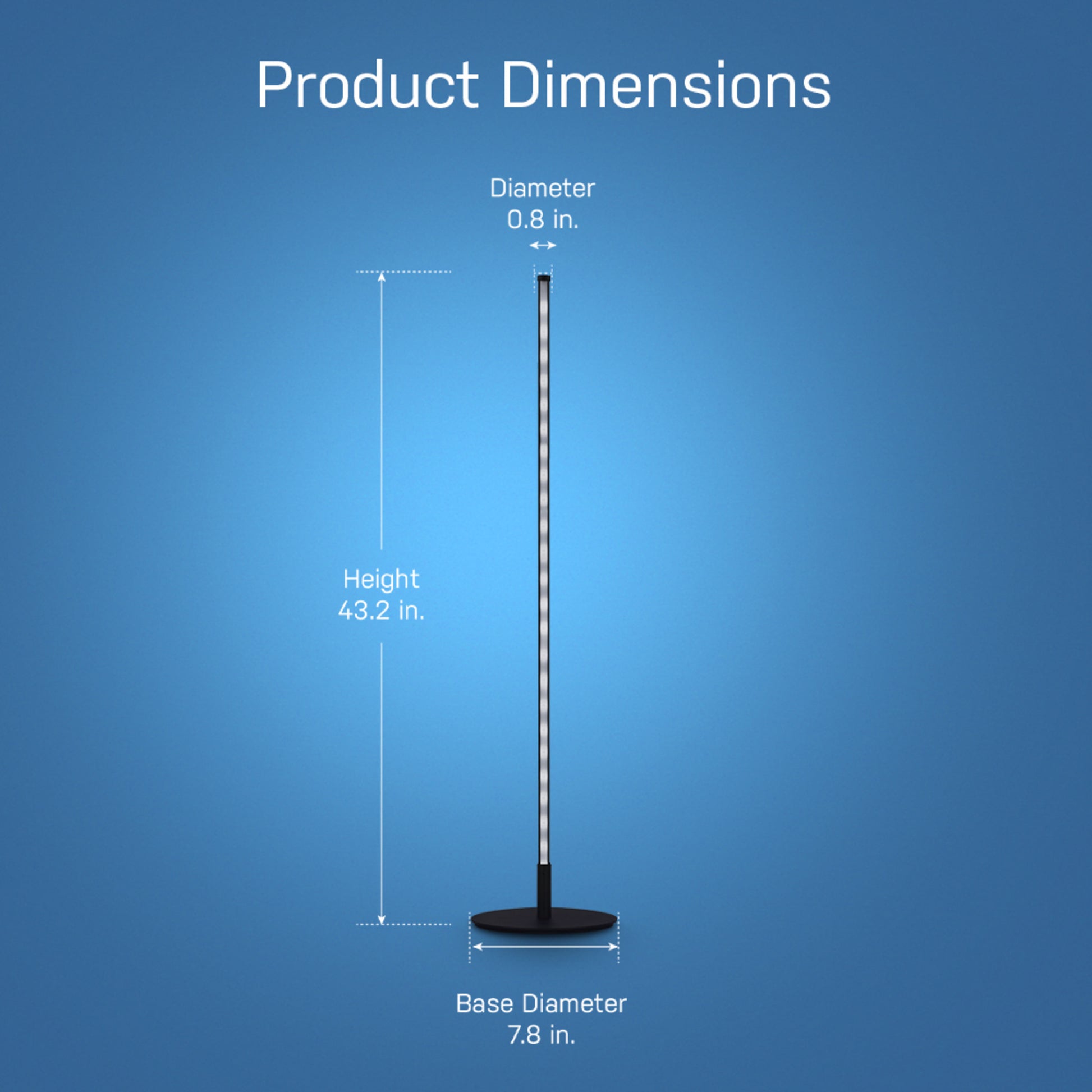 Sync your lights to music and movies with the 42-inch smart floor lamp from Feit Electric. This low-profile light stand features a sleek black aluminum finish and smart connectivity that allows you to select from millions of colors at the touch of a button. Pair it with the Feit Electric mobile app or add Alexa/Google voice assistants to individually control segments of the light with full color spectrum and saturation control. Select preset color scenes like Sunset for orange and yellow hues, Romantic for red hues, and Christmas for red and green hues, plus many more. Or, create your own custom scene for your special occasion or event. It also includes preset effects like Fade, Pulse, Flash, and Chase, with customizable speed and directions. For cool lighting effects, keep your Feit app open and select Music. The FLOOR42/RGB/BLK/AG uses your phone’s microphone to listen for sound and react to the beat of the music. Set up fast effects to get pumped up for video gaming or parties or set a relaxing waterfall scene to unwind. Setup is simple: connect directly to your home Wi-Fi using a 2.4GHz network. If you don’t have a smart device, you can still cycle through preset color scenes by plugging it in and double tapping the ON/OFF button after pairing mode ends and the light stops flashing red. Upgrade your lighting to this truly customizable color floor lamp that lights up your room without taking up a ton of space.