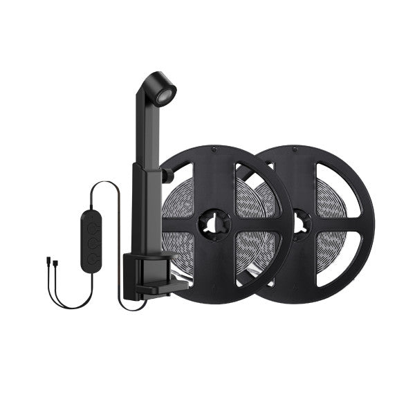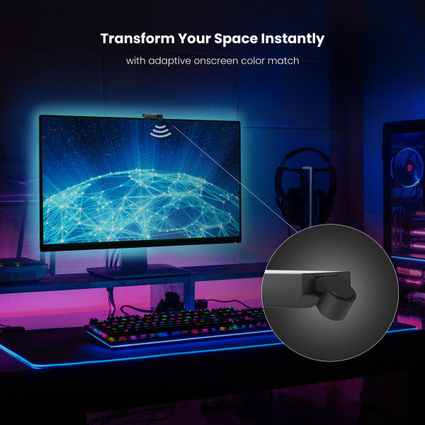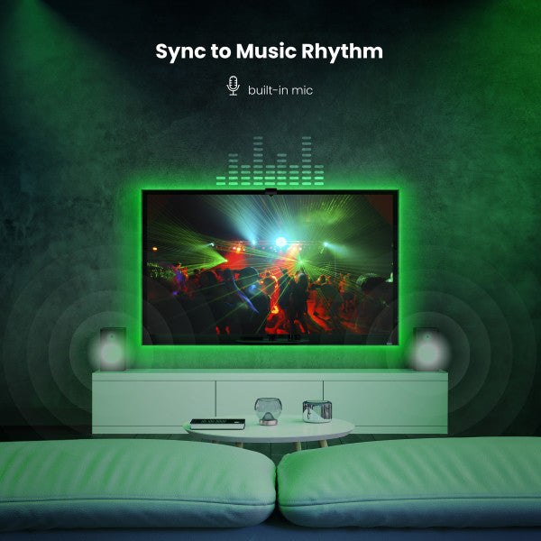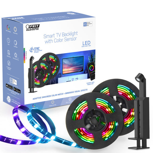evolutionize your TV and gaming experience with Feit Electric's Smart TV Backlight with Color Sensor. These smart tape lights are optimized for 55-inch to 85-inch screens, enveloping you in vibrant colors and ambiance. With their adjustable color sensor, tape lights match the on-screen colors to extend light beyond your screen. Choose preset scenes or experience a synchronized visual experience. Sync lights to transform your entire space into a reactive entertainment space for movies and games. Enhance parties with epic light shows that match your music using Music Sync. The onboard microphone means you don't even have to keep your phone screen on. The smart TV backlight picks up any ambient sound. These lights also serve as bias lighting, providing a balanced contrast between the screen and ambient lighting. Say goodbye to eye strain and enjoy true-to-life colors that enhance every scene. Unlike other complicated smart home lighting systems, setting up the smart TV backlight is effortless. No hub or calibration is required. Simply center the adjustable sensor on top of your screen. Adhere the lights to the back of your TV using the adhesive backing and mounting clips, then plug them in! The sensor automatically captures the colors on your screen. Connect to the Feit Electric app on your 2.4 GHz home Wi-Fi and enjoy immersive lighting effects. Elevate your TV viewing experience with these sleek, cutting-edge smart tape lights.